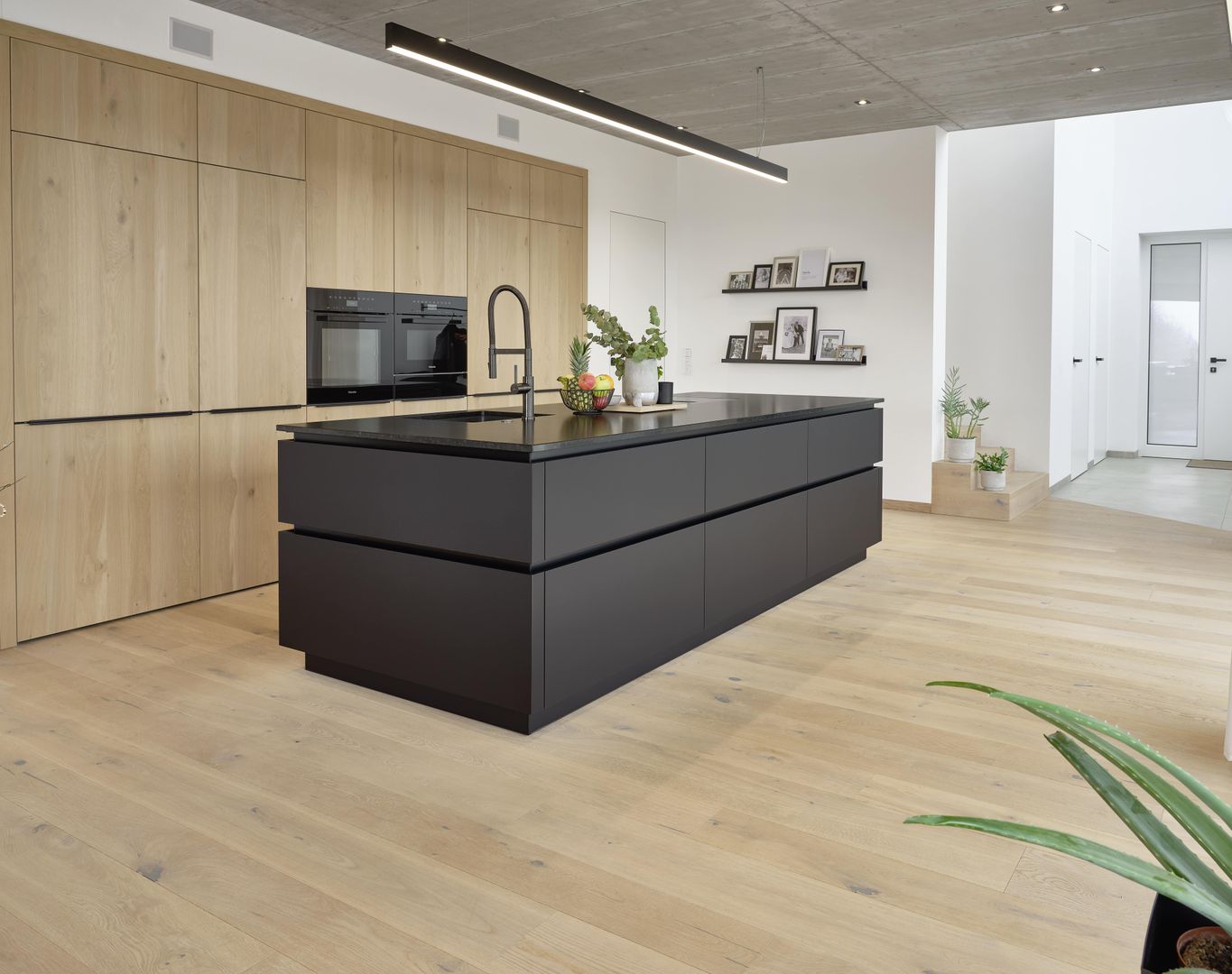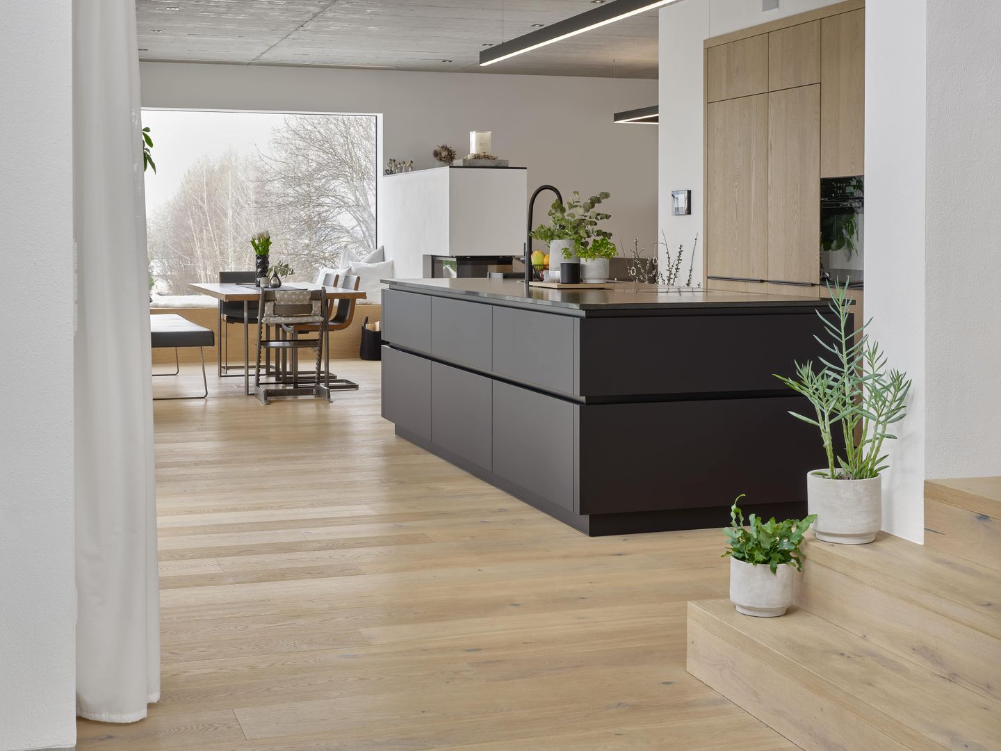 Hier wurde eine Holzfront passend zum Boden gewählt und als Kontrast die dunkle Insel mit Griffmulden in der EWE Fina mit der Nanoo Oberfläche.